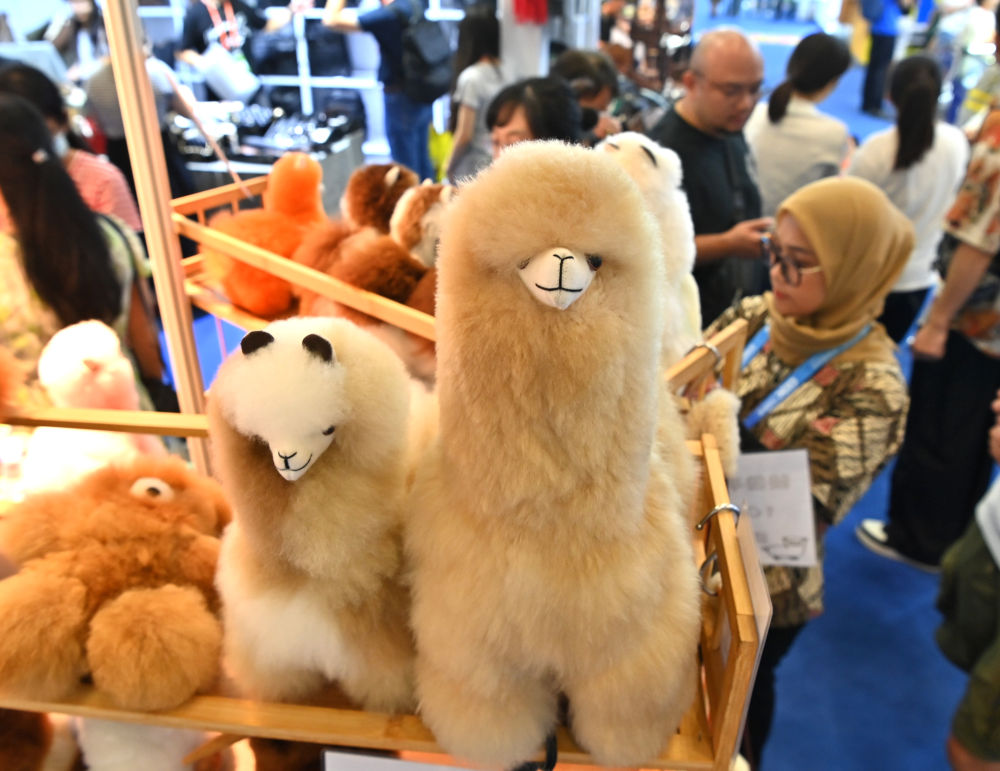 2024年9月28日,不雅众正在中国东盟博览会上挑选秘鲁羊驼毛公仔。(记者 周华 摄)。