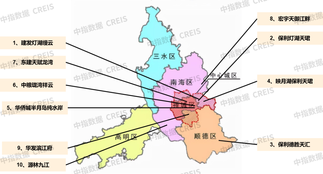 各区分布:TOP10项目发卖额榜单中,南海区最多,共5个项目上榜,次要集中正在千灯湖周边,部门分布于里水、。禅城区3个项目上榜,别离位于祖庙板块以及张槎板块。顺德区2个楼盘上榜,此中1个位于大良、1个位于佛山新城。