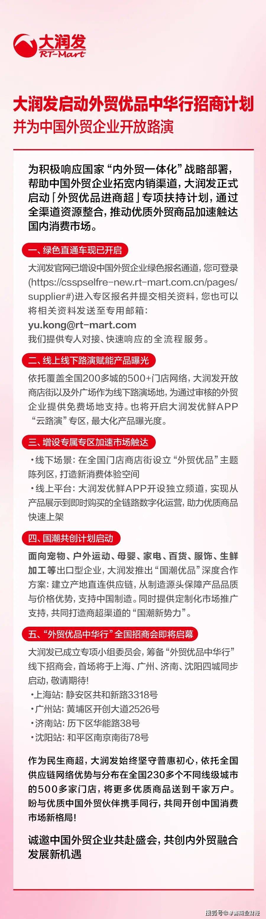 大润颁发示,为无力响应国度“表里贸一体化”计谋放置,大润发正式外贸进商超专项搀扶规划,借帮全渠道资本整合,促使优良外贸商品敏捷触及国内消费市场。大润发官网已添加中国外贸企业绿色报名通道,同时成立专项小组委员会,筹备“外贸中华行”线下招商会,首场将正在上海、广州、济南、