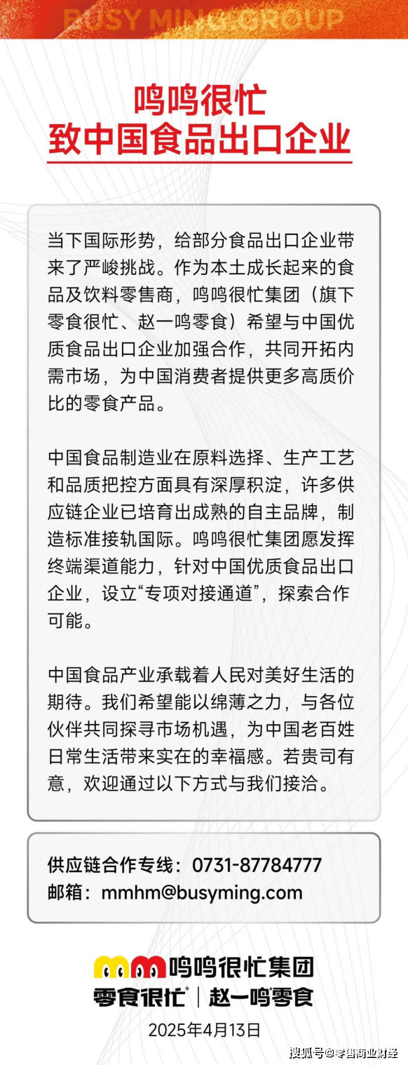 4月13日,鸣鸣很忙集团发布致中国食物出口企业的一封信。做为本士成长起来的食物及饮料零售商,鸣鸣很忙集团(旗下零食很忙、赵一鸣零食)但愿取中国优良食物出口企业加强合做,配合开辟内需市场,为中国消费者供给更多高质价比的零食产物。鸣呜很忙集团暗示,愿阐扬终端渠道能力,针对中国优良食物出口企业,设立“专项对接通道”,摸索合做可能。